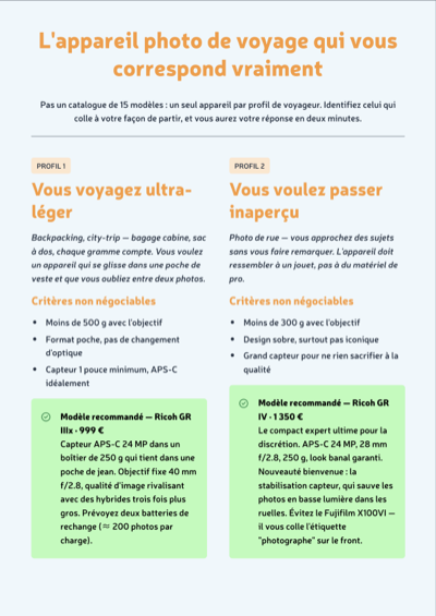 | Profil voyageur | Appareil recommandé | Prix | Poids total | Points forts |