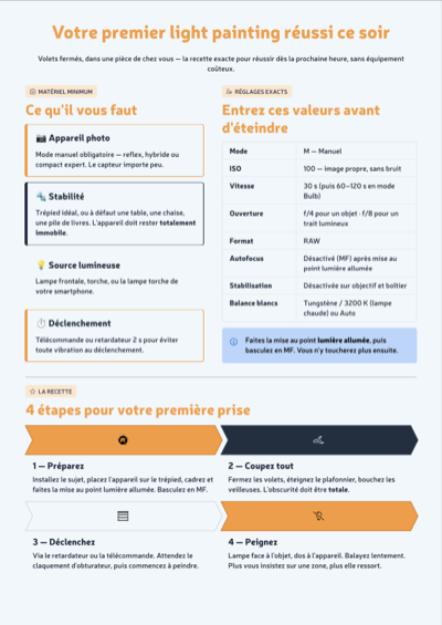Si vous êtes pressés, on pourrait facilement résumer le light painting en une recette en trois points :