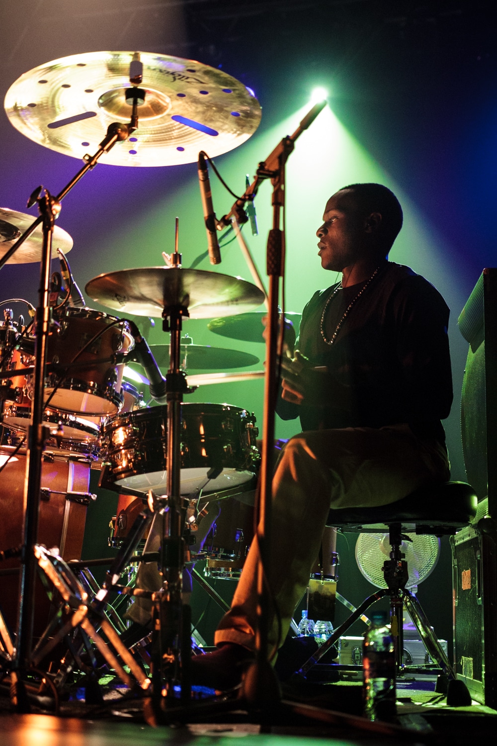 Typiquement, j’utilise le petit zoom pour saisir le groupe en entier, un musicien d’assez près (ce qui renforce les perspectives et fait « rentrer » dans l’image), ou les interactions avec le public. Le gros zoom est plutôt destiné aux portraits serrés des musiciens, et au batteur, toujours trop loin 😉