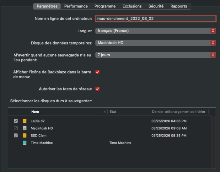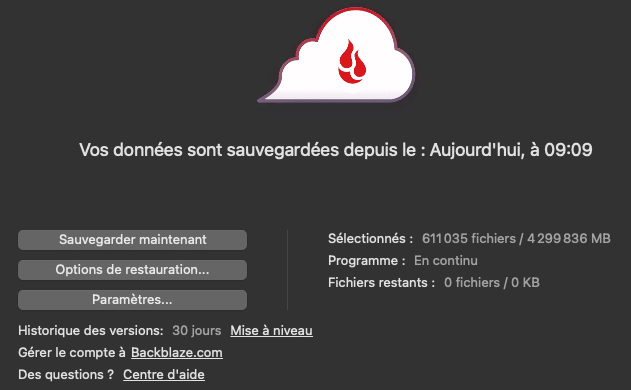 • Copie 3 (sauvegarde cloud) : Backblaze qui sauvegarde automatiquement votre ordinateur et vos disques externes. C’est votre assurance contre les catastrophes.