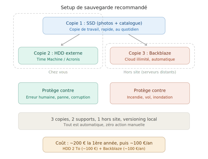 Configuration typique : fichiers originaux sur un disque, une copie sur un disque externe, et Backblaze (cloud avec versioning) comme troisième copie.